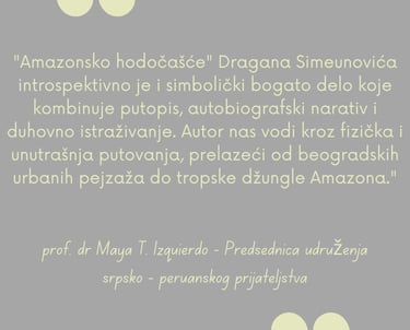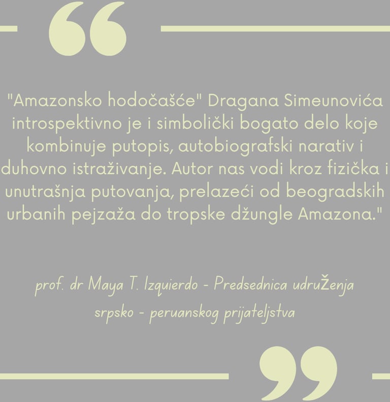 Dragan Simeunović kao nesporno nadaren pripovedač, za temu romana Amazonsko hodočašće odabrao je da istraži pitanje duhovnosti. Mladalačka interesovanja i zapitanost pred velikim temama, dopunjena studijama filozofije, Dragan Simeunović je upotpunio posetom Amazoniji. Na jednom od poslednjih mesta na planeti na kojima je moguće iskusiti spiritualnost u najčistijoj formi, ostao je sam pred prvim pokretačem i poslednjim razlogom. Ili pred sobom?
